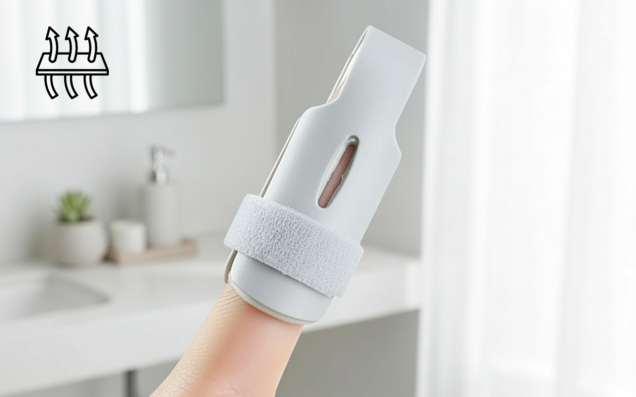 Special holes let air flow easily, keeping skin cool and fresh. Wear the Ortorex finger splint longer without sweating or feeling itchy.