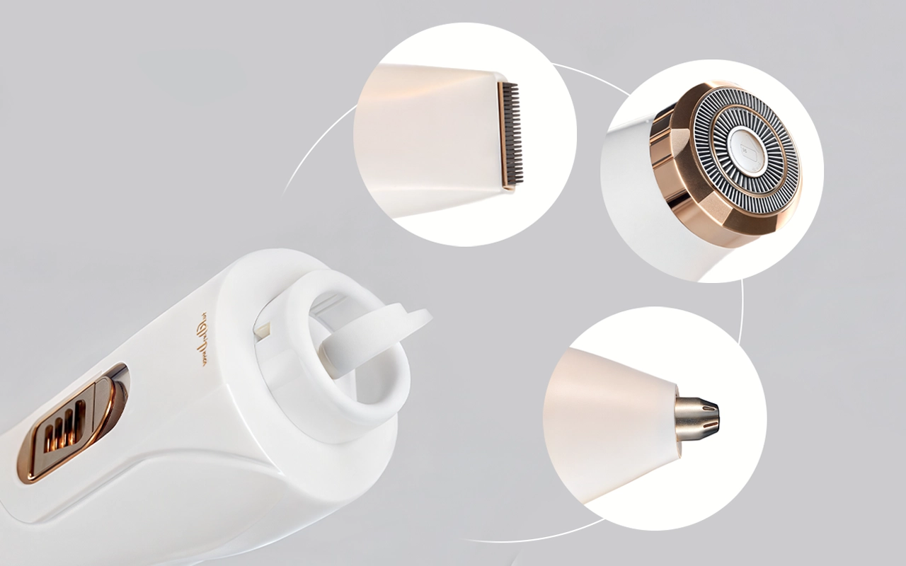 Three attachments handle the face, underarms, legs, and bikini line. One compact device fits anywhere for effortless grooming everywhere.