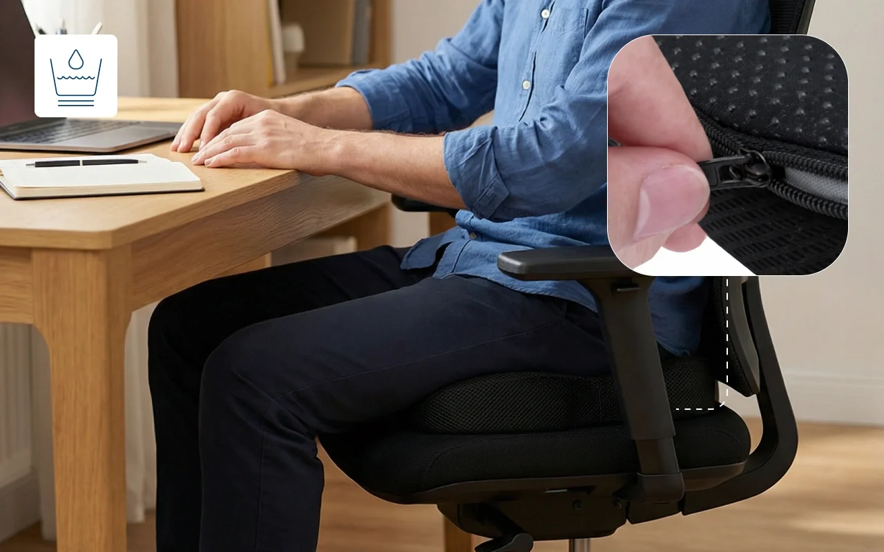 Air flows through the mesh cover, and the gel layer stays cool. No more sweating or feeling hot while you sit for hours.