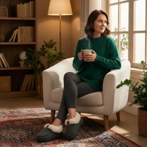 Thick plush lining surrounds your feet in gentle softness. Perfect for chilly mornings or for relaxing indoors after work.