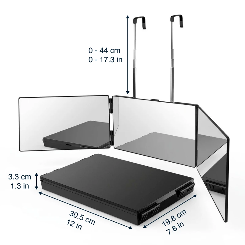 Ortorex trifold mirror quickly and easily solves daily grooming struggles. Adjust the height for full visibility while styling or shaving. Fold it flat to fit in bags and drawers for travel. Find clear reflections for haircuts, make-up, or skincare every day.