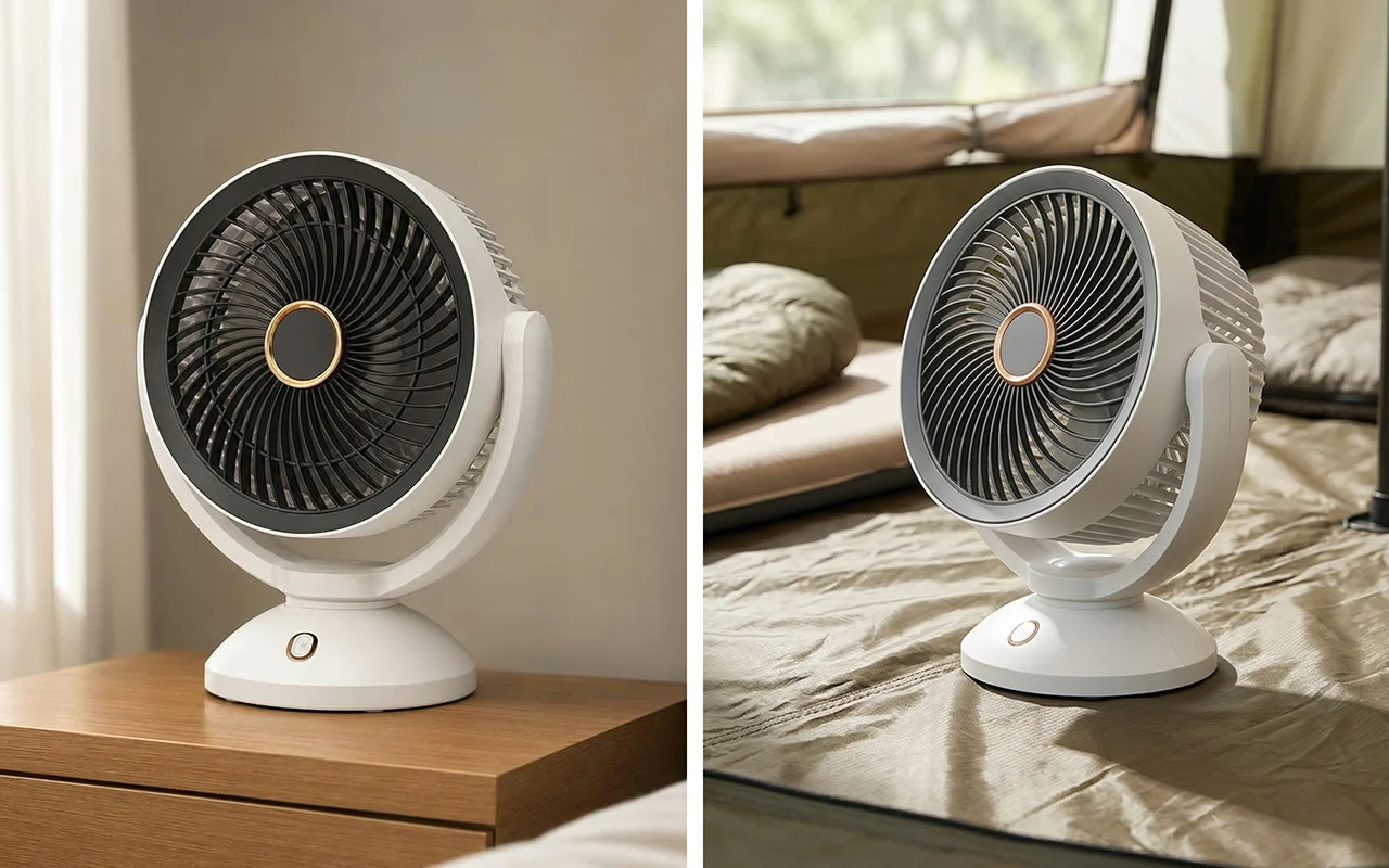 We took this small fan camping last weekend. It ran off a power bank all night, kept the tent from feeling stuffy, and packed easily in my backpack.