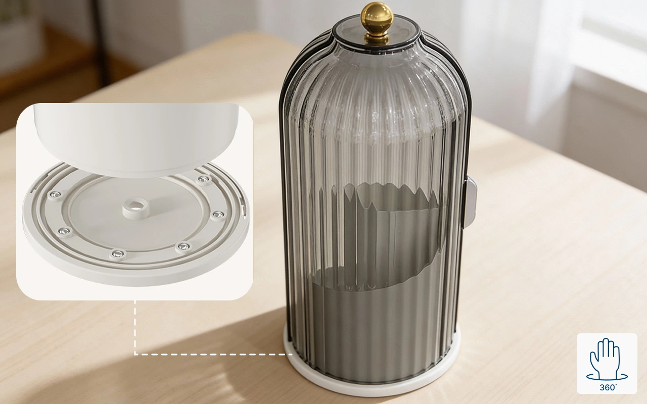 Spins perfectly and doesn’t tip over. My brushes stay upright, and I spend way less time getting ready in the morning now.