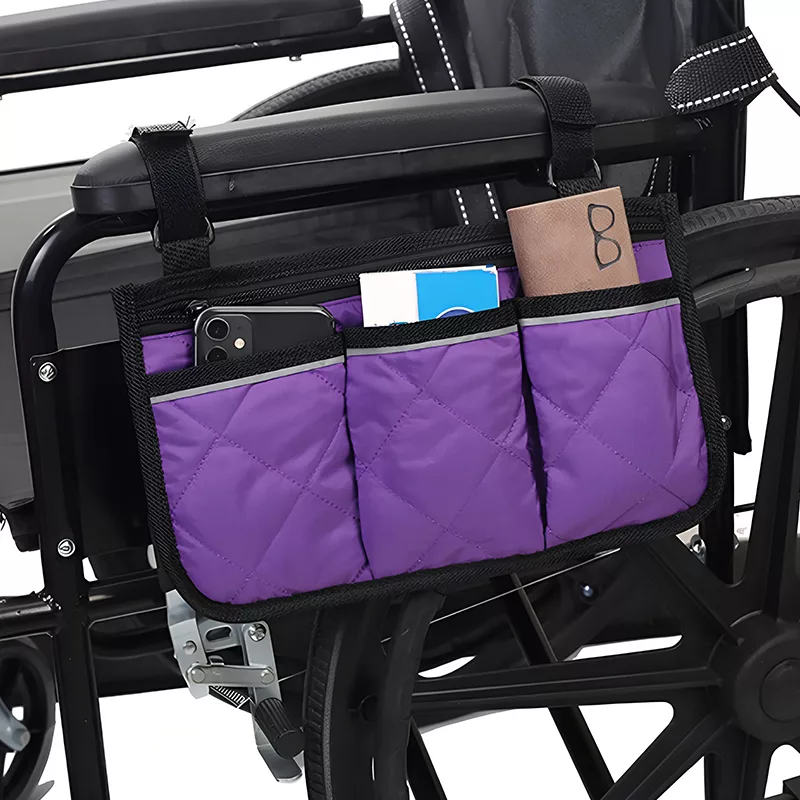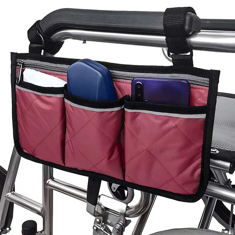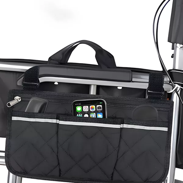 Ortorex wheelchair bag attaches securely and stays in place. Multiple pockets keep items tidy and easy to find. Reflective trim boosts visibility for safety at night.